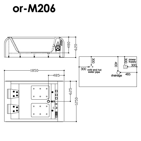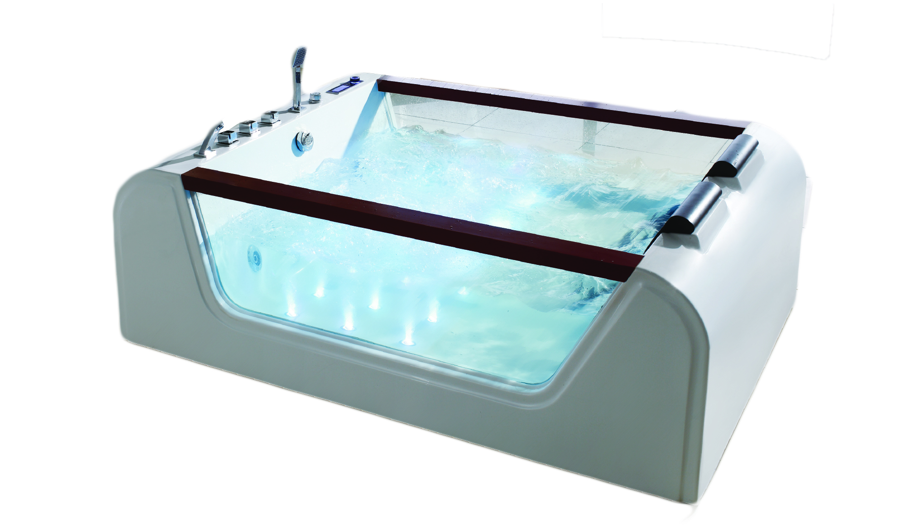Two-Seater Whirlpool Bath– 1850 x 1250 x 620 mm (Full body)– 10 Hydroflow Massage Jets– 12 Air Bubble Jets– Digital Control Panel– Mixer with shower– 12 Underwater Color LED light– Cascade Spout– Heater– Ozone-1.5 HP pump